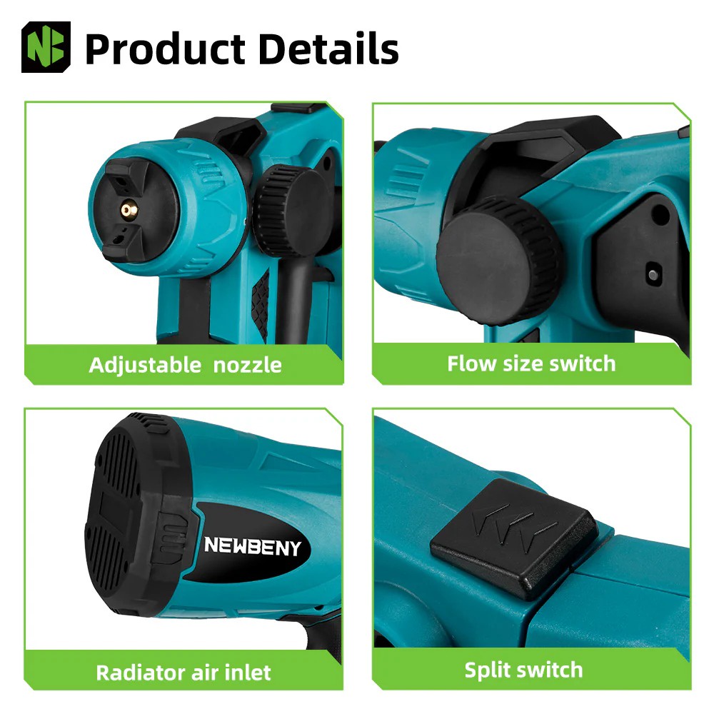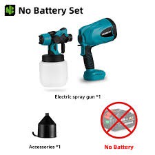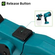 الجهاز في الصورة هو مسدس رش لاسلكي أزرق يعمل ببطارية 18V متوافق مع بطاريات Makita — الموصفات الشائعة لهذا النوع: